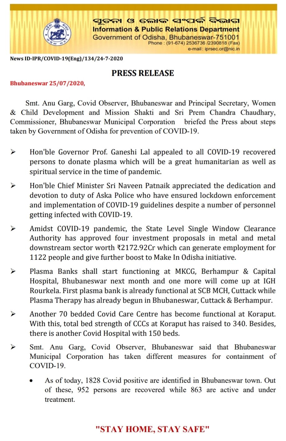 H Fw Dept Odisha On Twitter Press Release On Covid19 25 July 2020